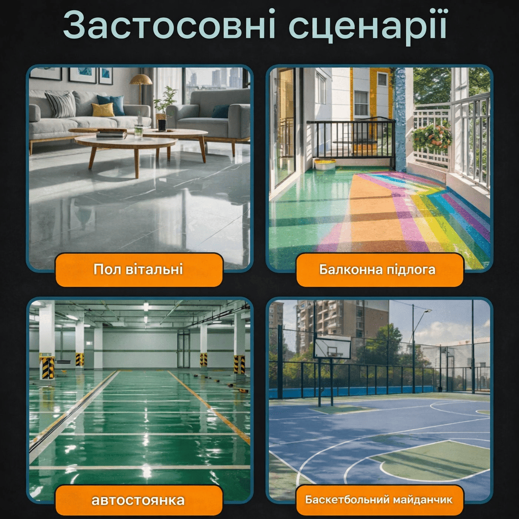 Дуже проста в нанесенні. Робили ремонт самі — фарба розтікається рівно і приховує дрібні дефекти підлоги. Через добу вже можна було нормально користуватися кімнатою.