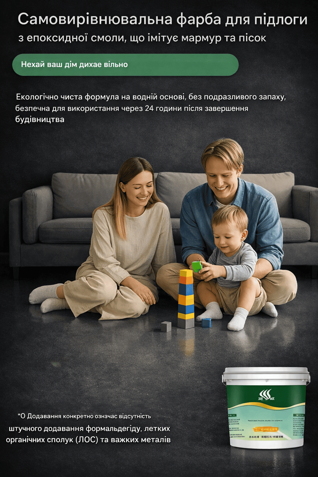 Покрили підлогу у вітальні цією фарбою — результат перевершив очікування. Поверхня рівна, гладка і виглядає як натуральний камінь. Майже немає запаху, що було дуже важливо для нас із дитиною.