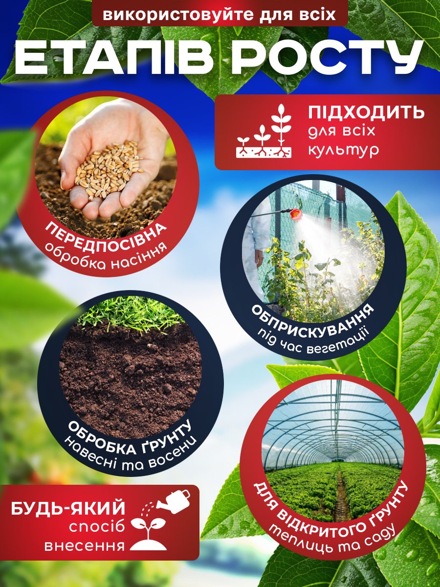 3. Застосування для овочевих, баштанних, ягідних та плодових культур Здійснюйте обприскування або фертигацію (внесення з поливною водою). Дозування: 5-10 г на 1 сотку.