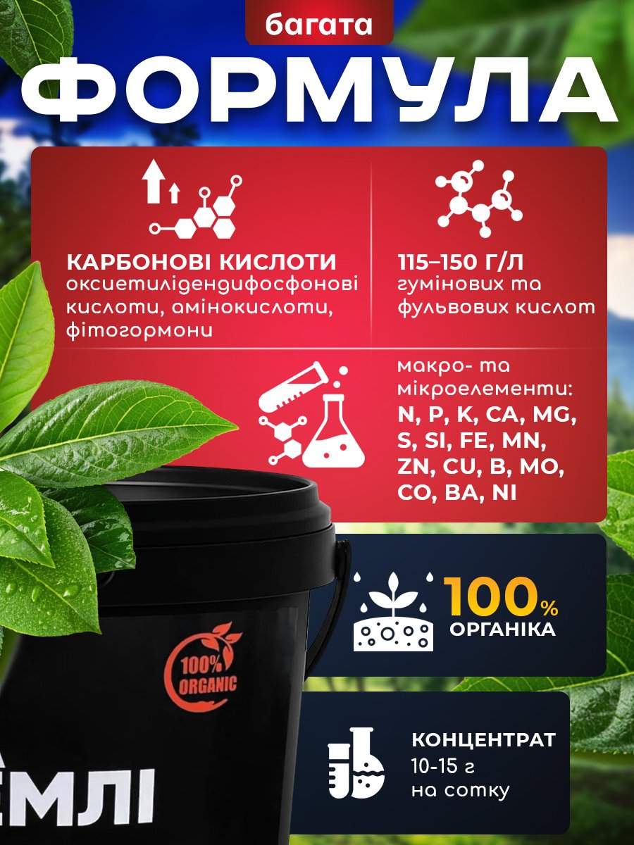 Сила Землі — це 100% органічне добриво з високим вмістом гумінових речовин 115-150 г/л, амінокислотами та макро- мікроелементами. Прискорює формування потужної кореневої системи, збільшує врожайність та пришвидшує дозрівання врожаю. Знімає стреси від погодних умов та засобів захисту рослин.