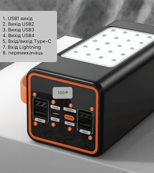 Портативна станція з реальною ємністю 100000 mAh 🔋, швидкою зарядкою 22.5W ⚡, вбудованим ліхтарем з потужним світлом 🔦 та цифровим індикатором заряду. Ідеальний варіант для дому, кемпінгу та тривалих відключень світла.